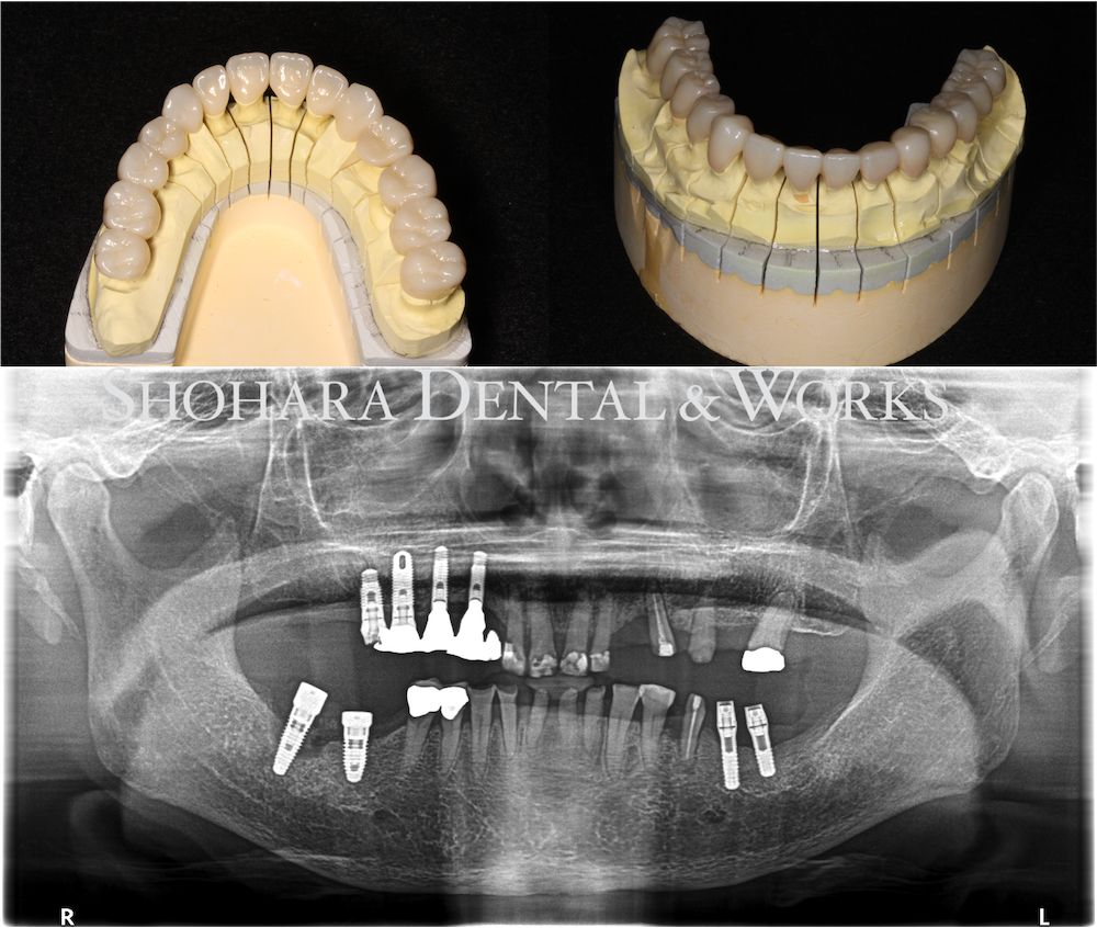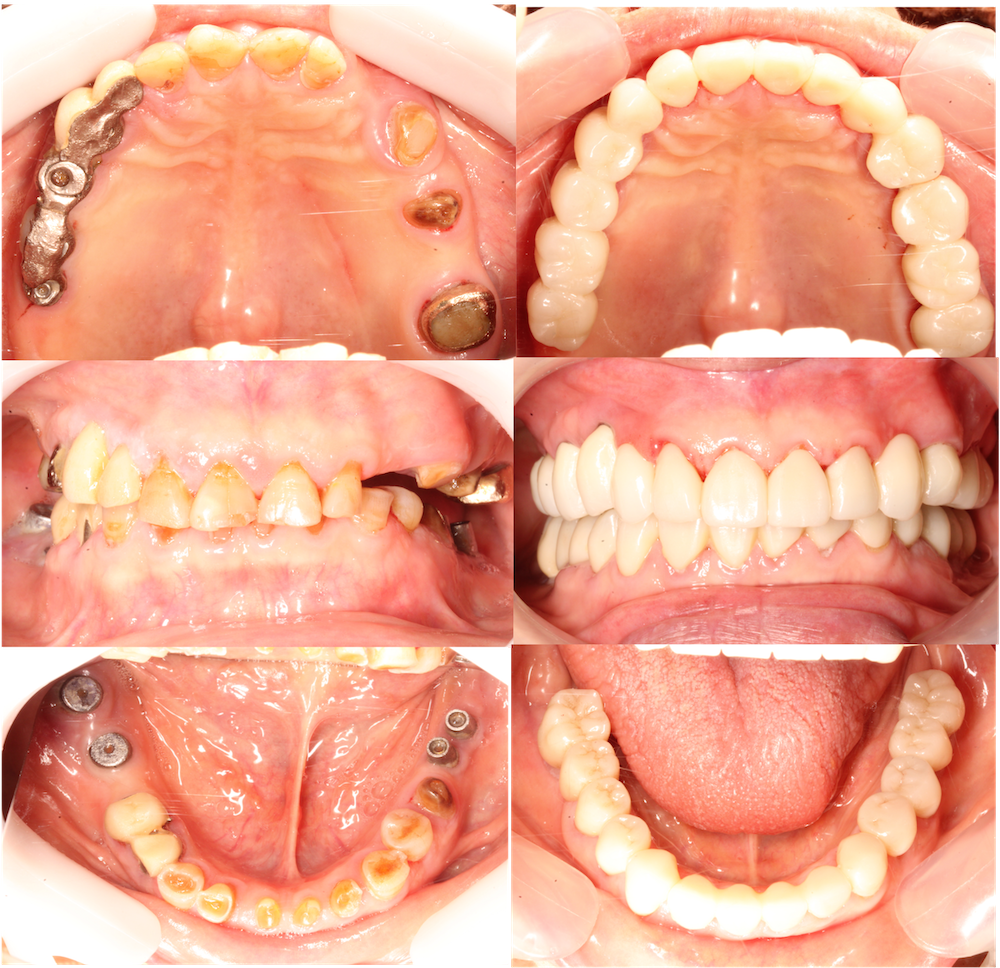 | 治療説明 | 既存のインプラントを利用し上部構造の再製作と、咬合再構成により全顎補綴を行った。 |