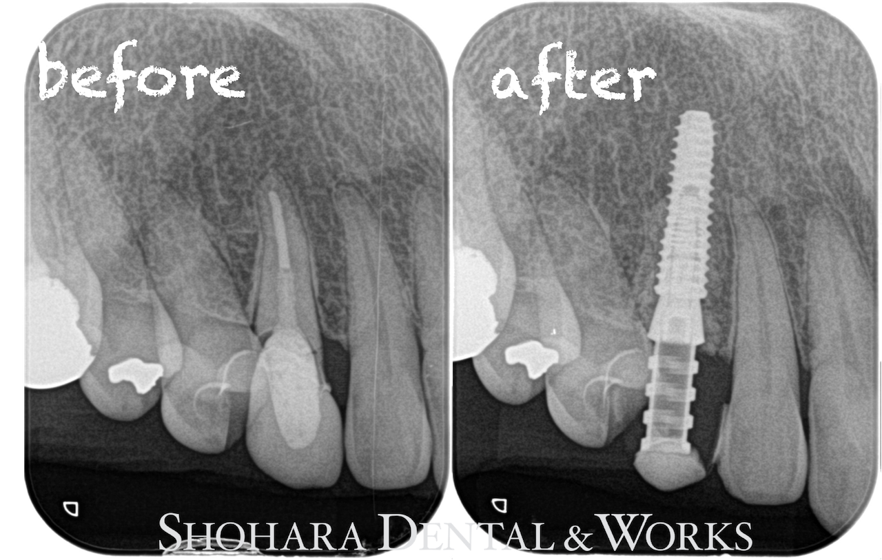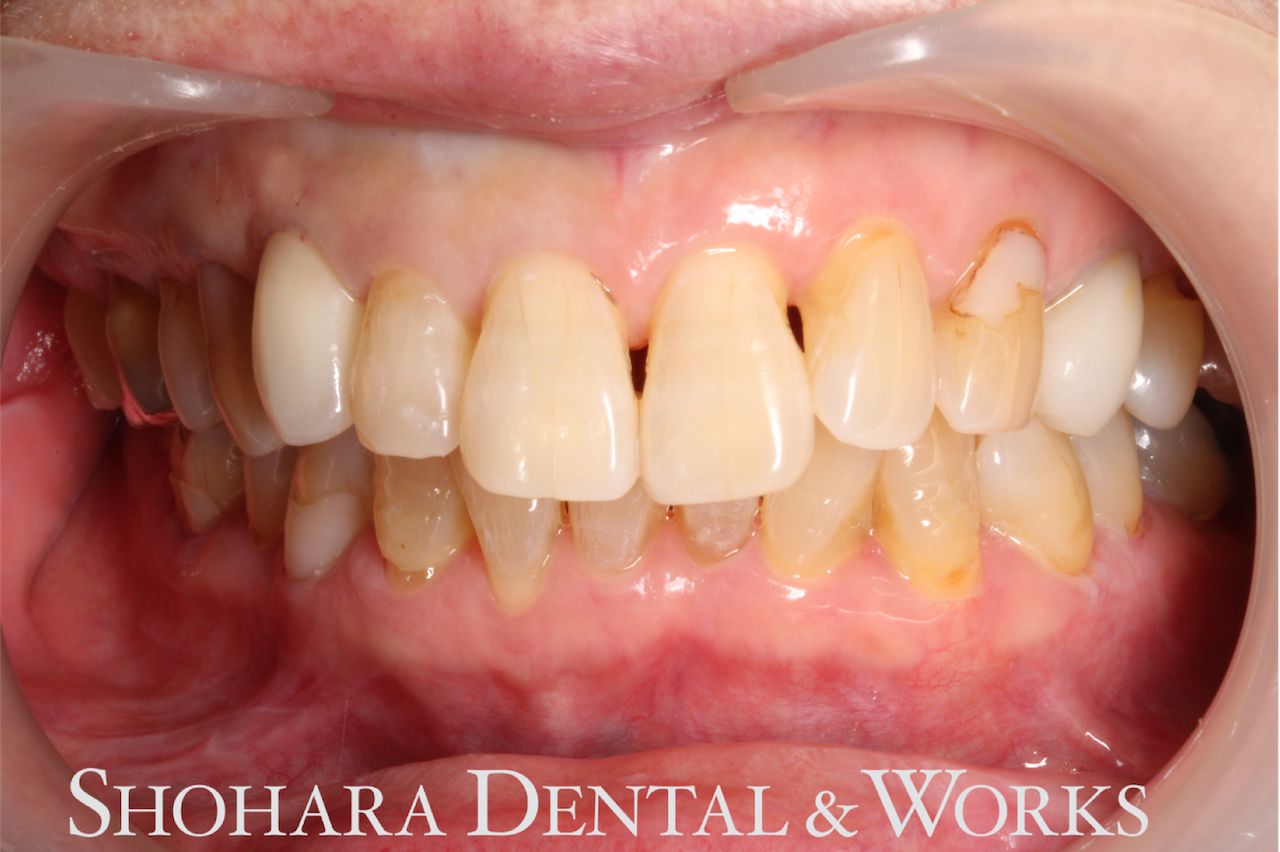 手術当日、保存困難な犬歯を抜歯して、即時でサージカルステントを用いてインプラントを埋入し、その日に仮歯を装着しました。