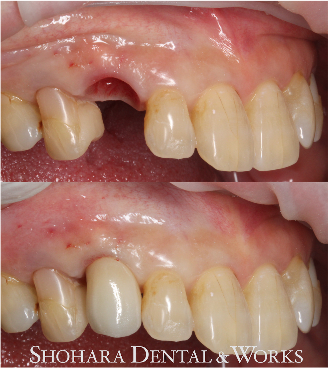 手術当日、保存困難な犬歯を抜歯して、即時でサージカルステントを用いてインプラントを埋入し、その日に仮歯を装着しました。
